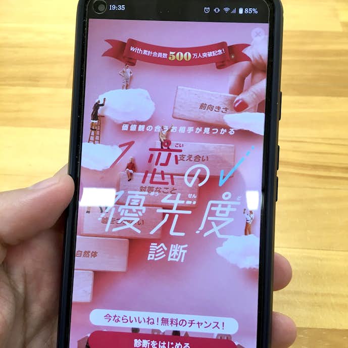 心理テストや性格診断は女性に人気で、出会い系のハードルをぐっと下げてくれた印象。普段出会い系を登録しないような女性も「withなら楽しそうだから登録した!」なんてことも多いみたいですね。