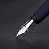 中位の価格帯に位置するモデルながら、ペン先は14金のいわゆる『金ペン』で、太さも極細から超極太まで11種類をラインナップ。『やや硬めの細字』はいちばん汎用性が高く、使い勝手のよいペン先です。デザイン的にも、ビジネスシーンにフィットする万年筆といえるでしょう。