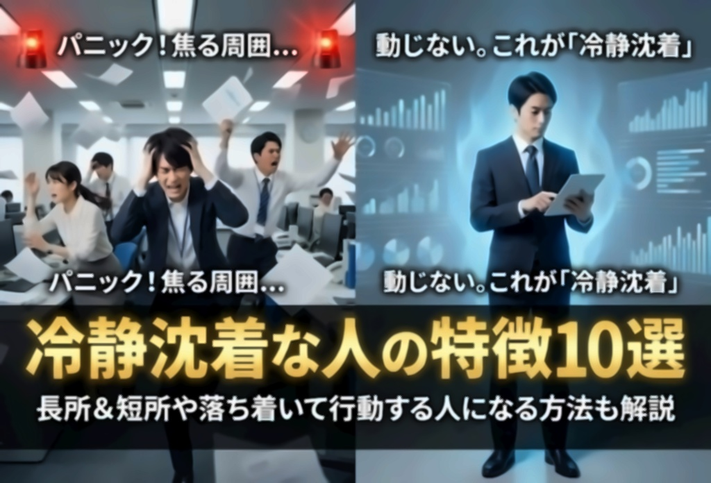 冷静沈着な人の見た目・性格・行動・言動にまつわる10個の特徴、さらに、冷静沈着な人の長所や短所、冷静沈着な人になる方法を詳しくお伝えしました。