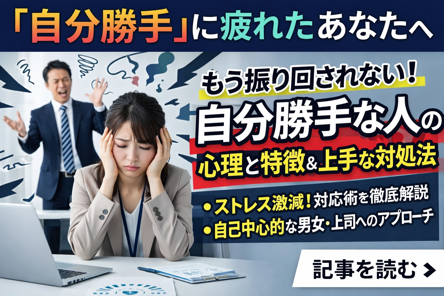 今回はそんな人間関係の悩みを抱える方に向けて、自分勝手な人の心理や特徴、自己中心的な男女や上司への上手な対処法を詳しく解説します。