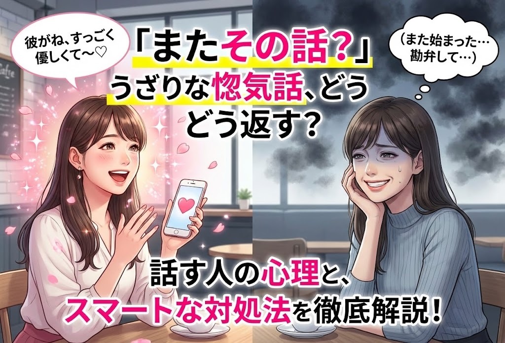 相手に悪気はないと分かっていても、何度も惚気話が続くと「どう返せばいいの?」と疲れてしまう人も多いでしょう。