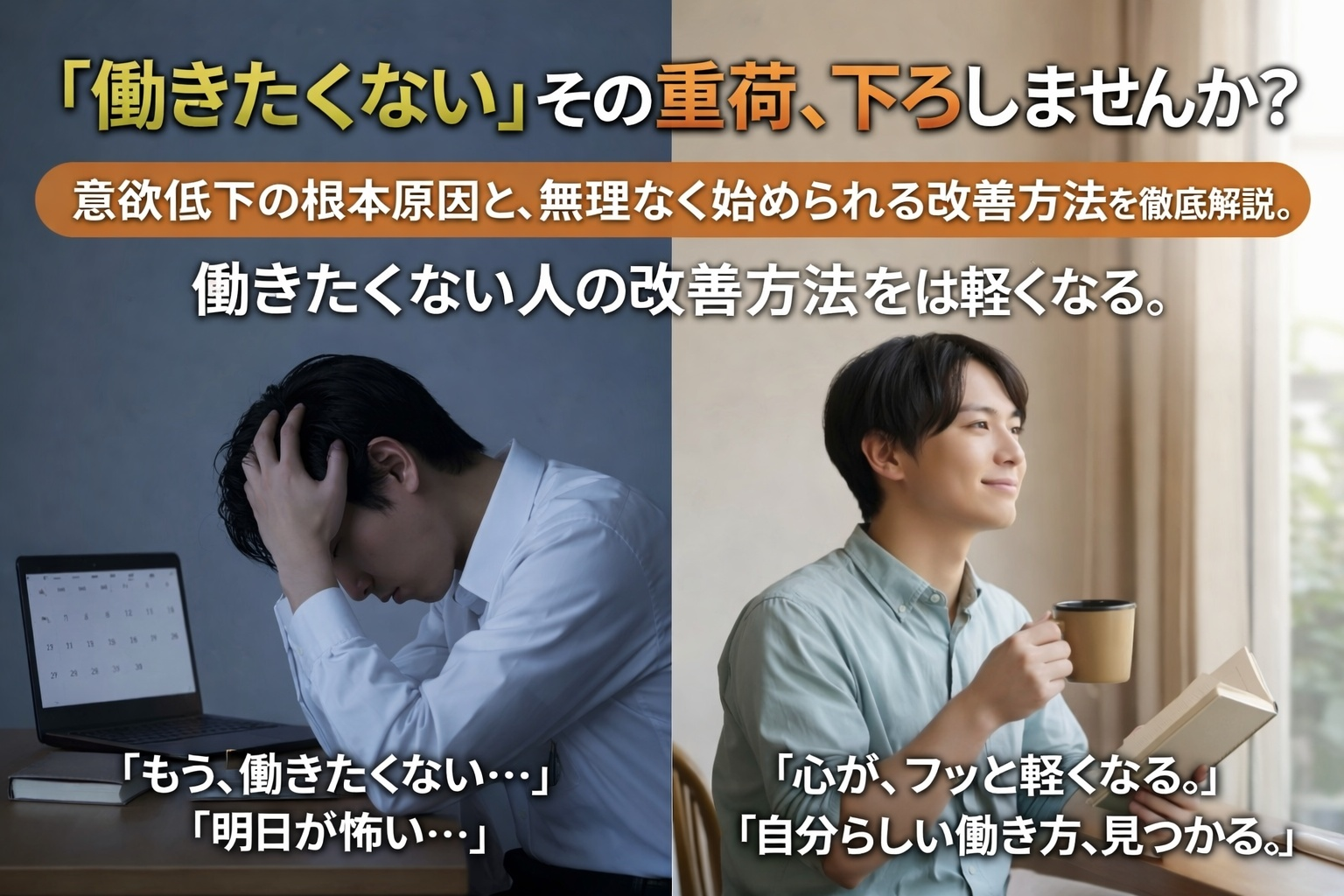 しっかり休めば体も回復して、本来のパフォーマンスを仕事でも発揮できますので、休んだ分もすぐに取り返せますよ。「労働意欲が出ないけど頑張らなきゃ!」と考えすぎず、まずは心と体の健康を気遣ってみるのも検討してみてくださいね。