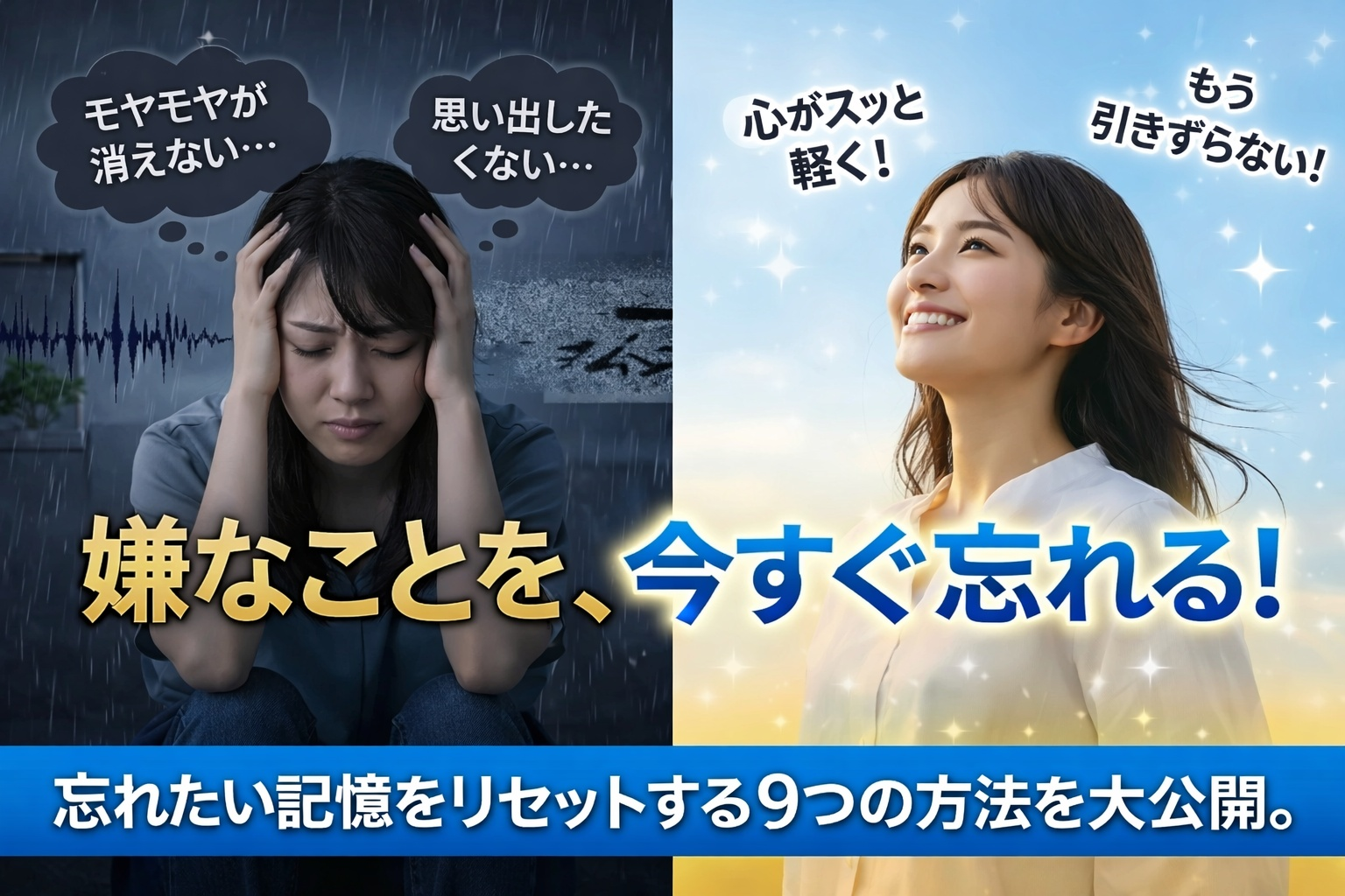辛いこと、嫌なことを消すにしても、仕事やプライベートのように日常と深く関わっていることが原因であれば根本的な解決は難しいです。仮に、嫌なことを忘れることができても、日常に原因があるので嫌なことに触れてしまいます。
