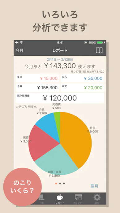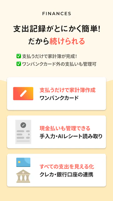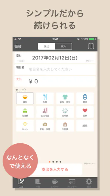機械類が苦手な人や女性でも使いやすい、シンプルな家計簿アプリです。