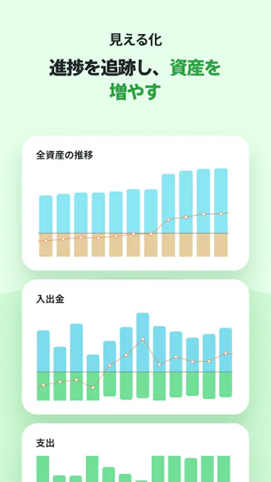 銀行口座やクレジットカード、電子マネー、マイル・ポイントカード、証券口座などの個人資産を登録するだけで自動更新されます。