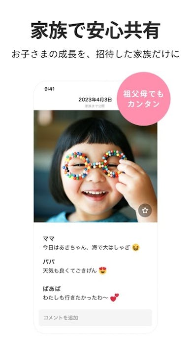 コメントやスタンプのやりとりも、家族だけの空間で楽しめる仕様なので、安心して子どもの成長記録を残せます。