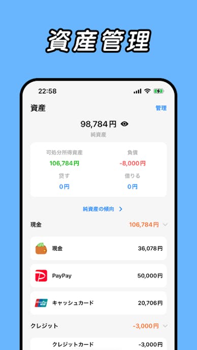 - 簡単な収支の他、口座やクレカ管理など資産管理も簡単にできる