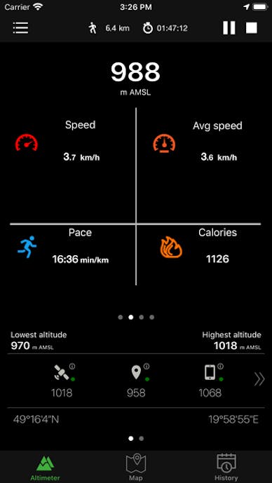 現在地の標高はメートル/フィートでリアルタイム表示され、最低/最高高度も記録OK。