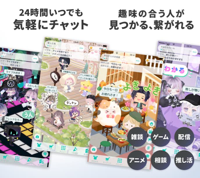 雑談から人狼バトルまで共通コンテンツが豊富なため、話題づくりに困らず自然に距離が縮まりますよ。