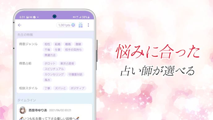 在籍する占い師は1万人以上の鑑定実績を持ち、プロフィールや口コミを見てから指名できる仕組み。