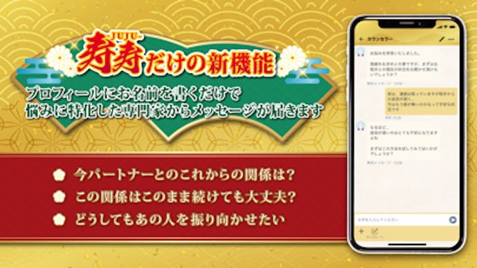 『寿寿 -JUJU-』は、恋愛に特化した匿名相談型の占いアプリ。