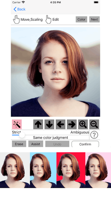 撮影後はAIが人物を瞬時に切り抜き、背景色を白・薄青・グレーなどにワンタップで変更可能。