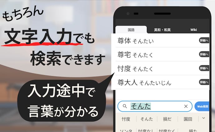 語の途中まで入力すると、その場で意味や読み方が“一発表示”され、候補をタップするだけで詳細解説に進めます。