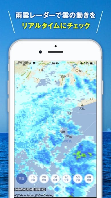 雨雲レーダーは10分刻みで60分先まで表示され、気象庁の警報や地震・津波・台風情報もアプリ内でチェックできます。