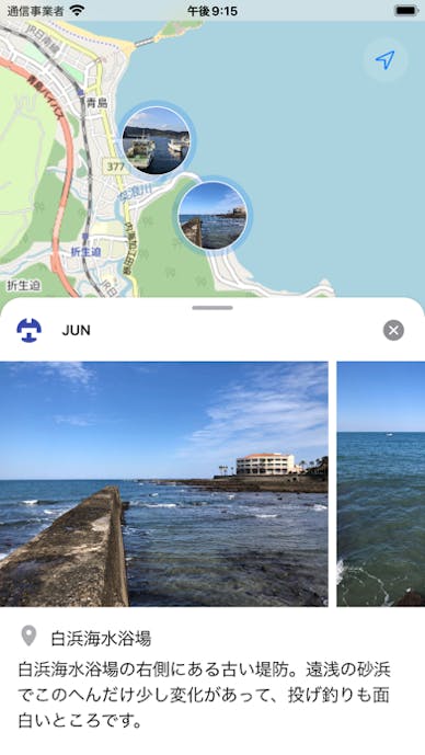 アプリを開くと近所のマップに投稿が並び、気になるピンをタップすると詳細が見られます。