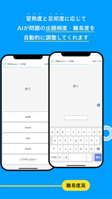 学習モードには忘却曲線に基づいた間隔反復とAIによるスマート採点が搭載され、苦手な単語だけを重点的に再出題してくれます。