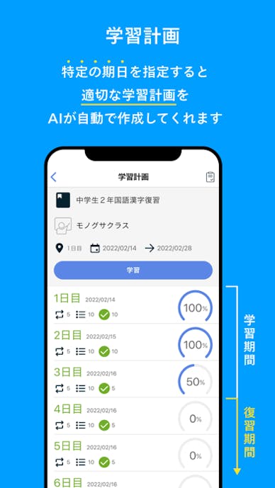 強化された間隔反復アルゴリズムが回答履歴を解析し、「忘れる直前」に合わせて効率的に学習を進められます。
