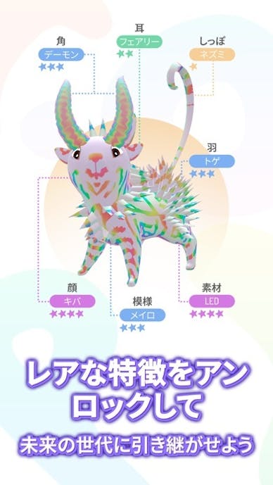 ドットは一匹ごとに異なるDNAで生成され、チーター柄やユニコーン角など組み合わせは無限。