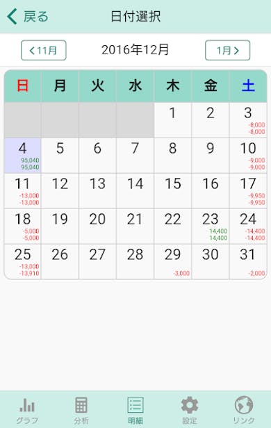 集計結果はカレンダーと折れ線グラフに反映され、黒字・赤字の流れを一目で把握できます。