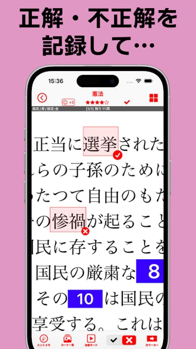 マーカーごとに正解・不正解を記録でき、間違えた部分だけを再出題して弱点を重点的に克服できるのが特徴。