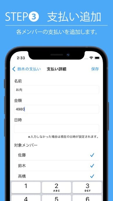 入力は人数や金額欄をタップし、テンキーで数値を入れて「入力」を押すだけ。