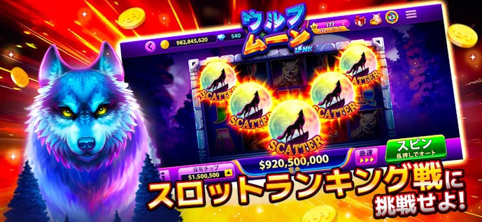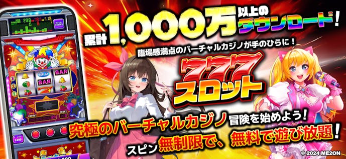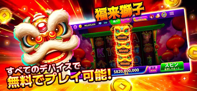 ダウンロードするだけで600万枚の無料コインがもらえ、200以上の多彩なスロット機種を楽しめます。