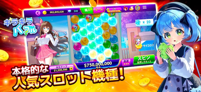 操作は非常にシンプルで、スピンボタンを押すだけの簡単操作。さらに、オートスピン機能も備えていて、放置しても遊べます。