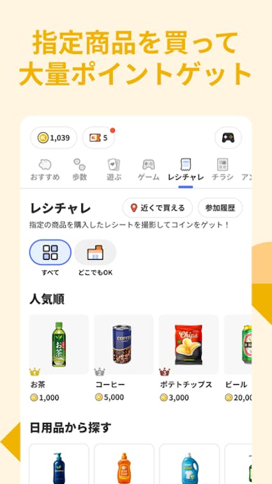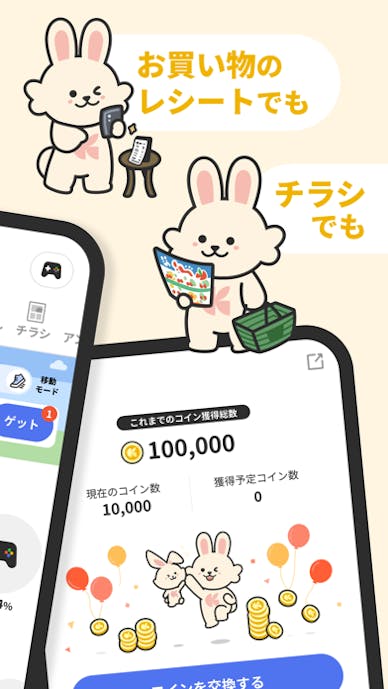獲得チャンスはウォーキングに限らず、チラシ閲覧やレシート送信、電車移動でもコインを獲得可能。