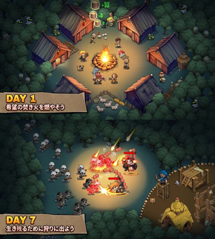 最初は木造の村だった拠点に、通路や施設を自由にレイアウトしながら、王国へと進化させていく達成感を味わえます。