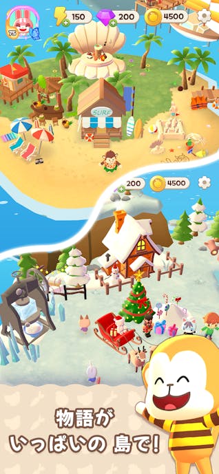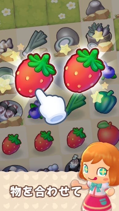 果物や野菜など同じピースを2つ合わせて進化させ、できたアイテムを動物たちに渡すと施設が増えて島がどんどん賑やかになります。