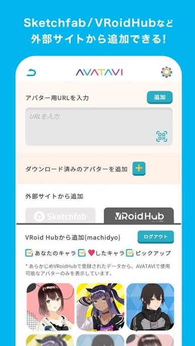 アバターは自作モデルにも対応しており、VRoid HubやSketchfabから取り込みも可能。