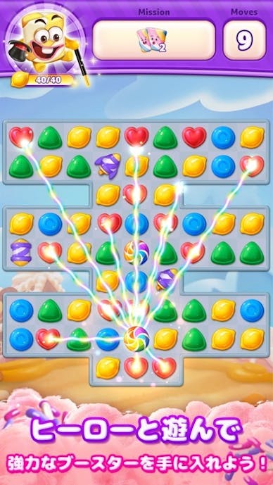 同じ色のキャンディーを3つ以上揃えて消すだけでなく、頭をフル回転させて特定のパターンを作り、連鎖反応を引き起こす工夫も必要となります。