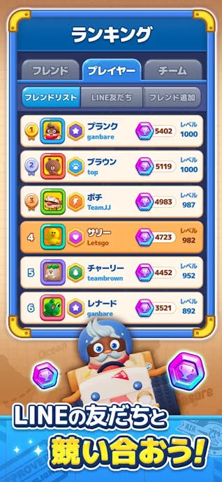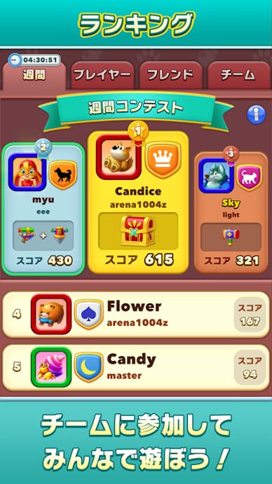 好きなキャラを5人編成し、可愛らしい3マッチパズルに挑戦します。