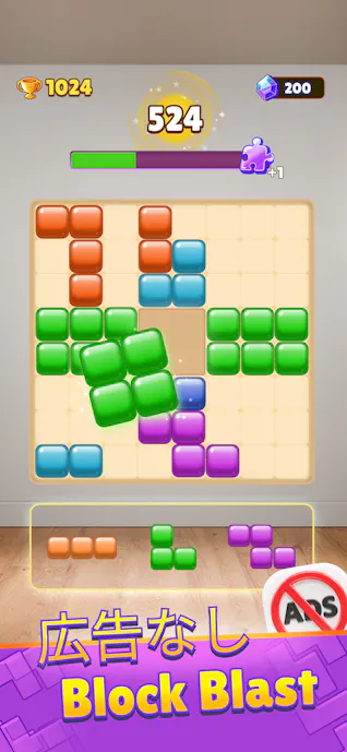 『ブロックブラスト』は、8×8のフィールドにブロックを自由に配置し、縦横いずれかの列を埋めてブロックを消すパズルゲーム。