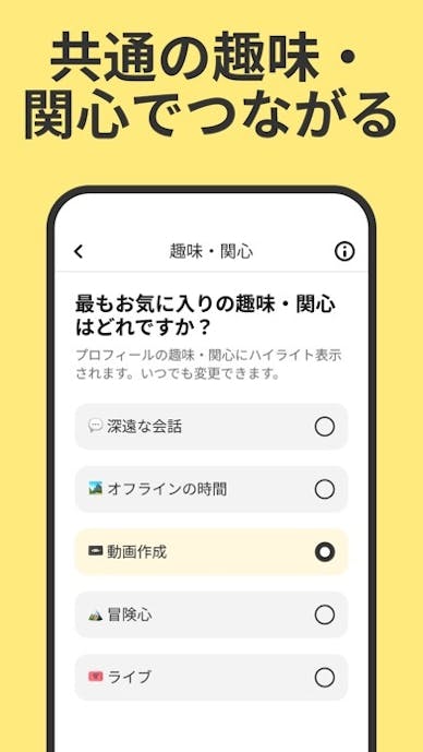 〈旅〉〈音楽〉〈読書〉などの〈興味タグ〉を書くだけで、共通点のある相手を自動マッチング。