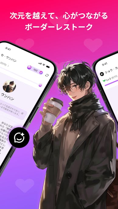 ジャンルは恋愛・日常・ファンタジーなど幅広く、キャラの見た目・性格・口調を自由に設定して、自分好みの相手を作れるのが魅力。