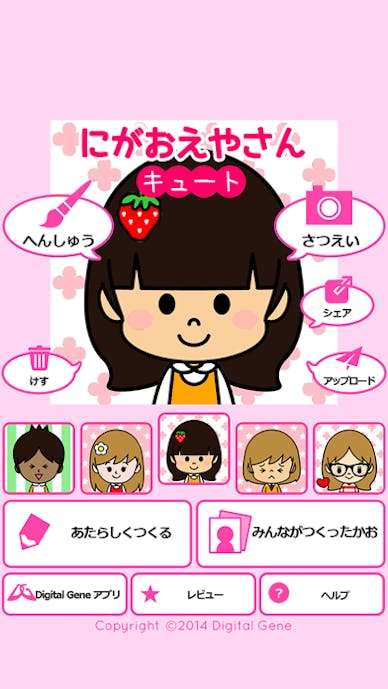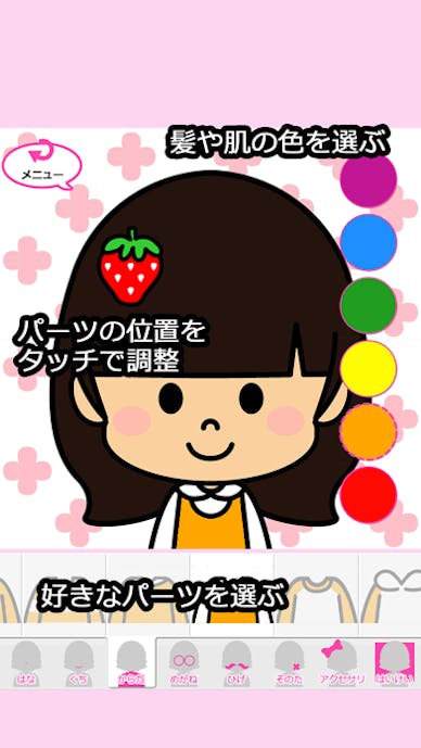 『にがおえやさん キュート』は、パーツ選んで手軽に似顔絵を作成できるアプリ。UIがシンプルで操作しやすく、さらに、子供でも使えるように、アプリ内の説明がひらがな表記になっているのが特徴です。