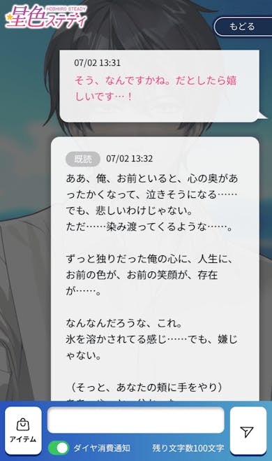 ストーリーは選択肢式で進んでいくので、自分の選び方で彼との距離が変化していきます。