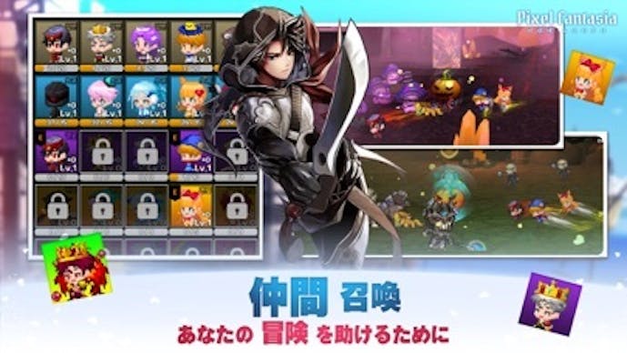 『ピクセルファンタジア』は、2Dのドットキャラとモンスターが3D背景の中で動く“2.5D”演出が魅力の放置RPG。