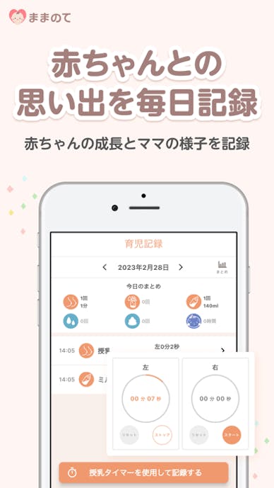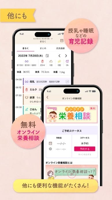 授乳や食事、睡眠やおむつ交換などを記録し、通知でリマインドでき、忙しい中でもリズムを整えやすい仕様です。