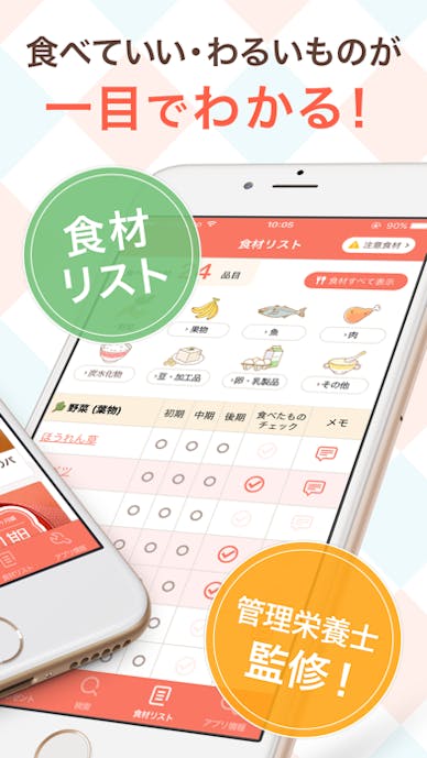 特徴は252食材のOK/NGや注意食材が一覧で確認できる点。