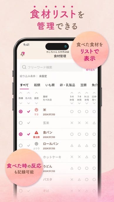食材リストには「初めて食べた日」や「食べた時の様子」を残せるので、食べ進みの記録にも役立ちます。