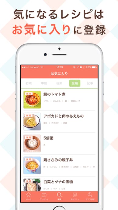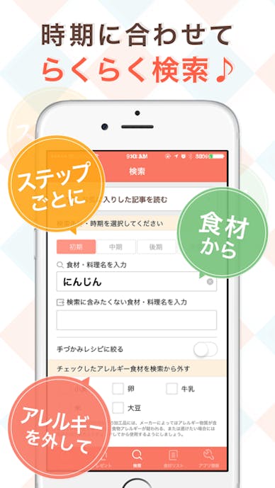 初期・中期・後期のステップ別や食材別、アレルギー除去など細かく検索でき、毎日の献立を迷わず決められます。