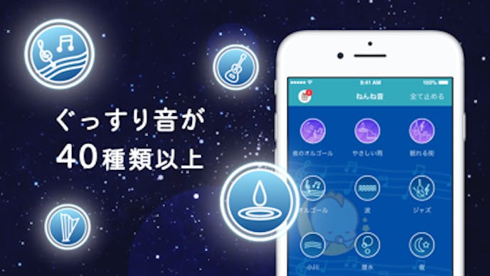 雨や小鳥、オルゴール、焚き火など全40種類以上の快眠音を収録し、自由に組み合わせて再生できるのが特徴です。