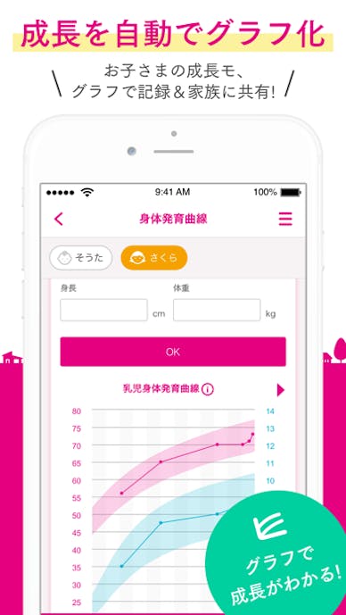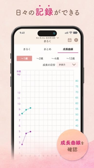赤ちゃんの成長記録もまとめて管理でき、身長や体重を入力するとグラフで推移が見えるため、成長を実感することが可能。