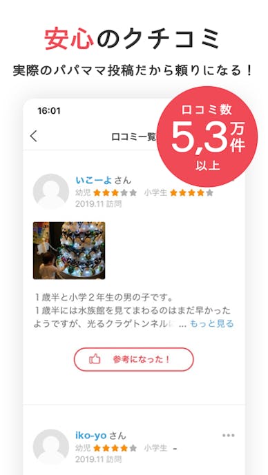 口コミ投稿機能を利用すれば、自分の体験を共有しながら他の家族の参考にもなるのが嬉しいところ。