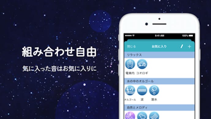 気に入った組み合わせはお気に入り保存が可能で、タイマー設定やバックグラウンド再生にも対応。