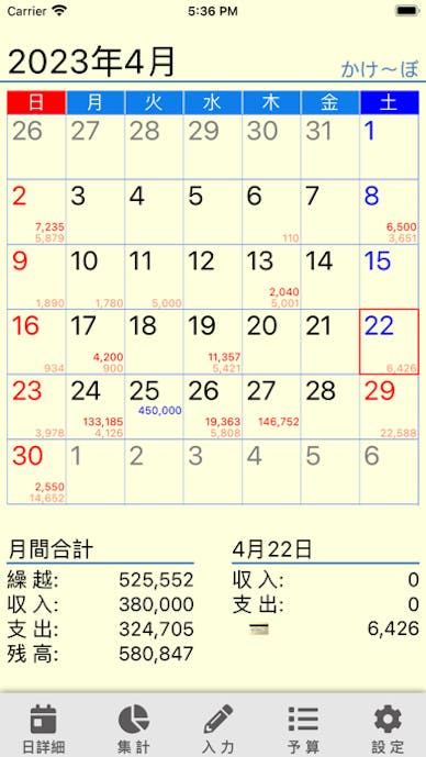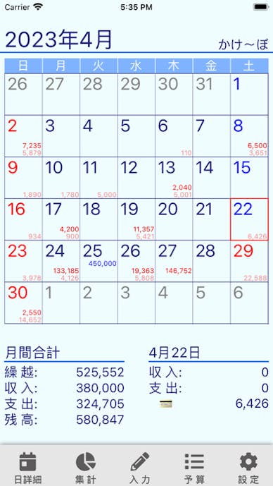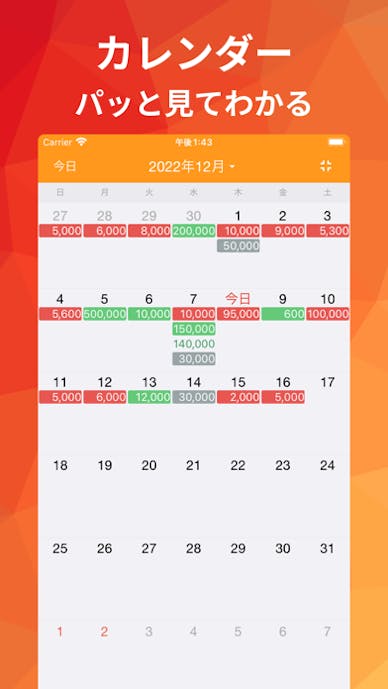 カレンダーで出費の多い日がすぐ分かるのが便利!