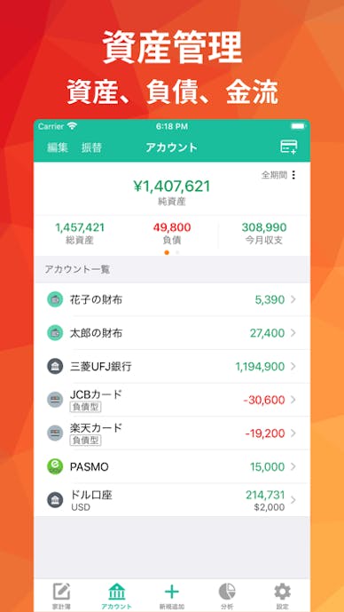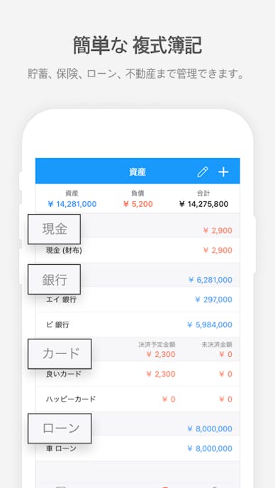 家計・予算・資産の推移をグラフで可視化でき、残高の把握もスムーズです。