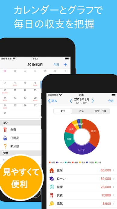 日々の支出はカレンダーで一目、収支や資産はグラフで推移を確認できるので、毎日の使いすぎに気づきやすい設計です。